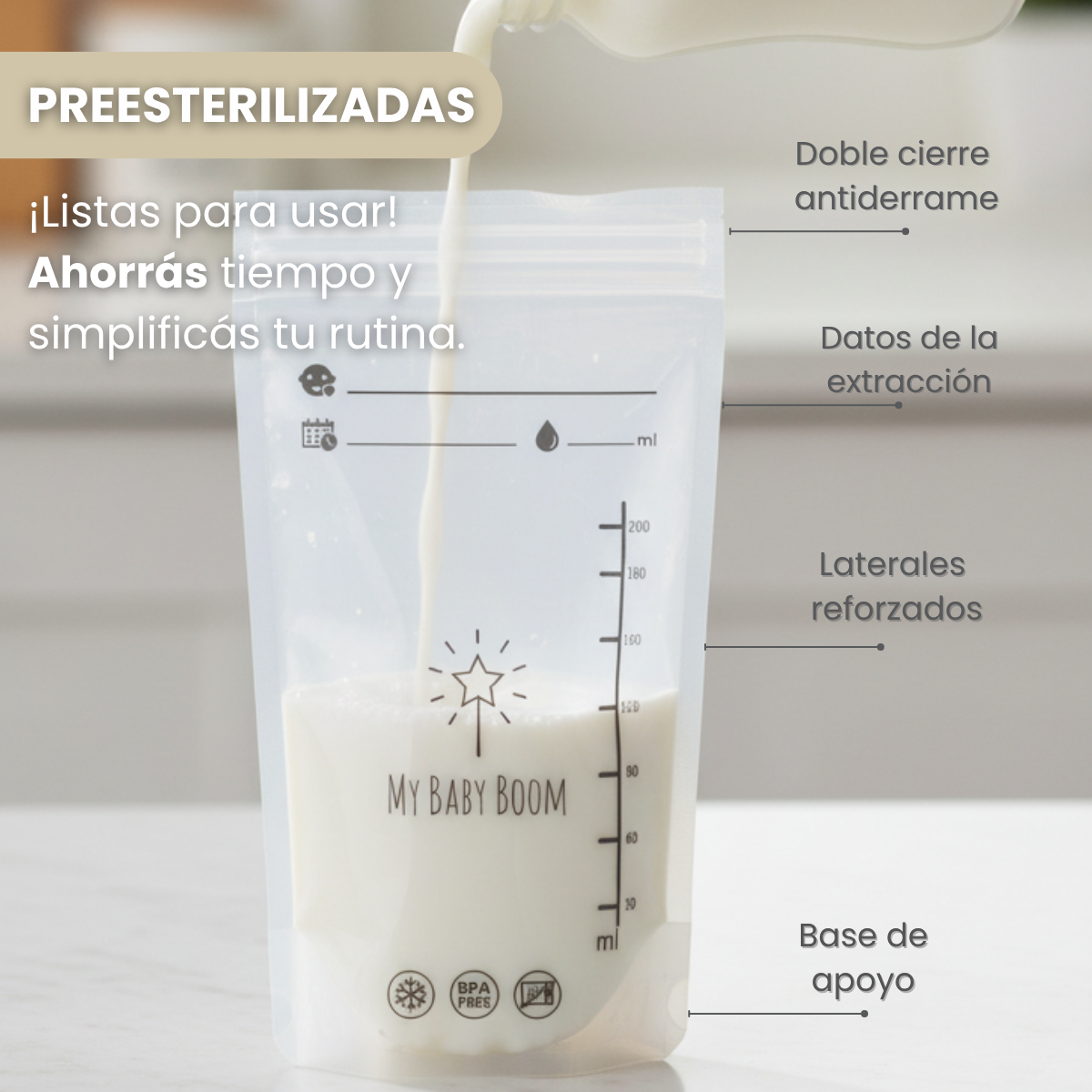 Listas para usar, con doble cierre antiderrame, base de apoyo y espacio para anotar la fecha de extracción. Ahorrás tiempo y simplificás tu rutina de lactancia.